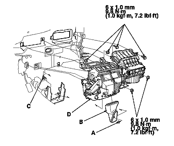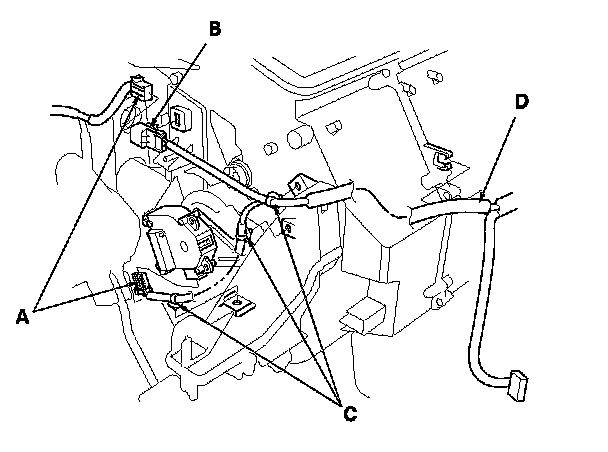 10. Disconnect the connectors (A) from the air mix control motor and A/C wire harness. Remove the connector clip (B), the wire harness clips (C), and the wire harness (D).