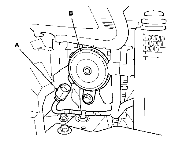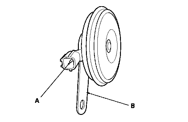 horn by connecting battery power to the terminal (A) and grounding the bracket (B). The horn should sound.