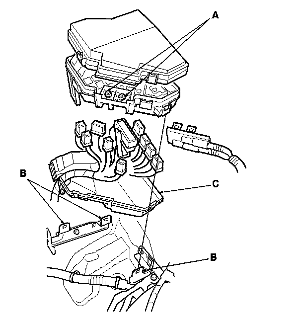 4. Release the tab (B), and then remove the bottom cover (C) from the under-hood fuse/relay box.