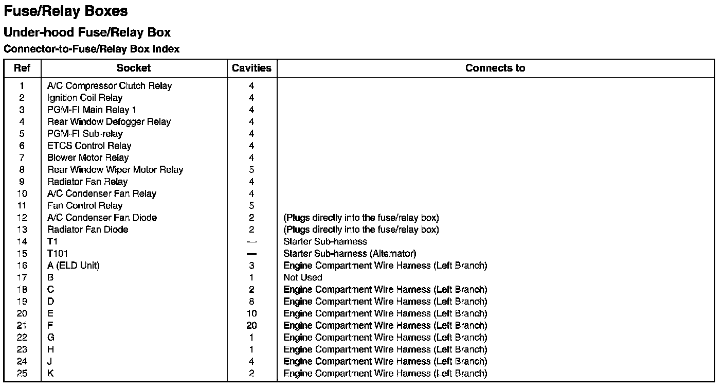 Under-hood Fuse/Relay Box - Connector-to-Fuse/Relay Box Index