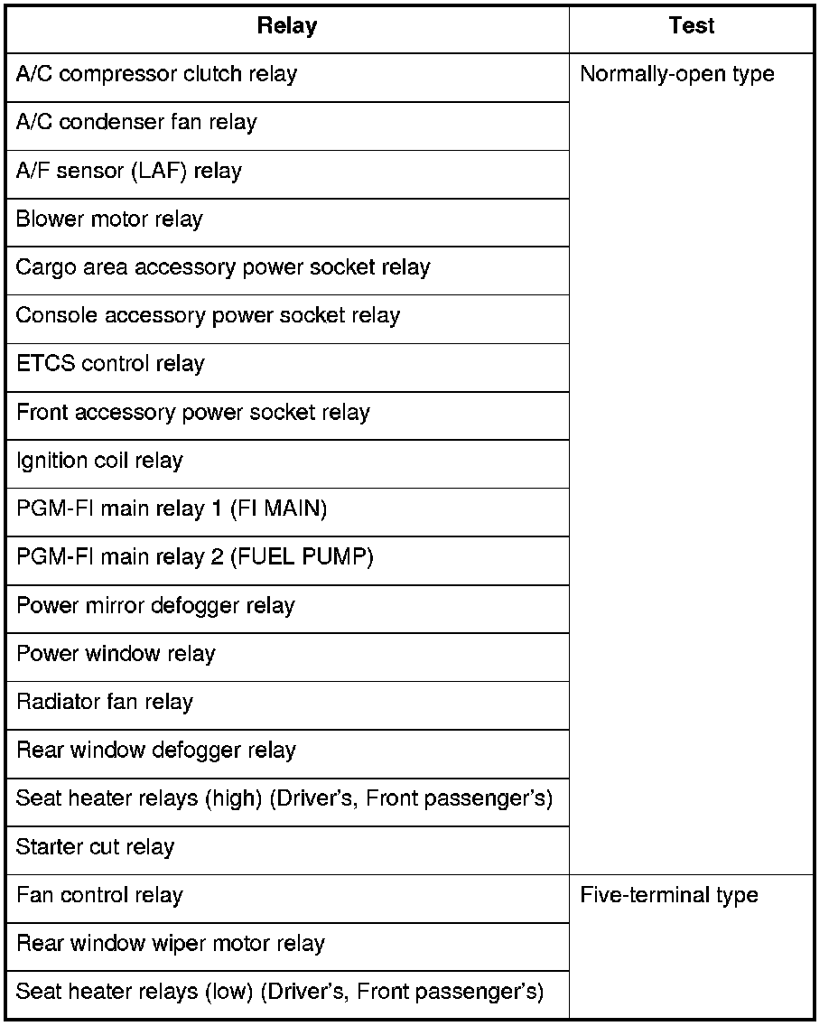 Use this chart to identify the type of relay, then do the test listed for it. Carefully remove the relay from the under-dash fuse/relay box using the relay puller. Do not use pliers. Pliers will damage the relay.