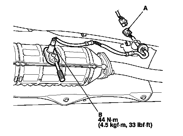 1. Disconnect the secondary HO2S 4P connector (A), then remove the secondary HO2S (B).