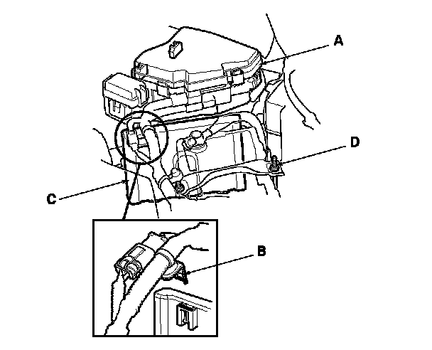 10. Loosen the battery hold down bolt (D) and reposition the battery away from the PCM.