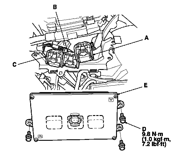 12. Remove the bolts (D), then remove the PCM (E).