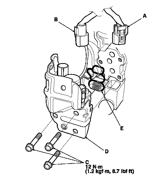 5. Install the parts in the reverse order of removal with a new solenoid valve filter (E) and a new O-ring.