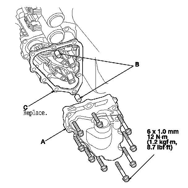 13. Remove the shift solenoid valve cover (A), the dowel pins (B), and the gasket (C).