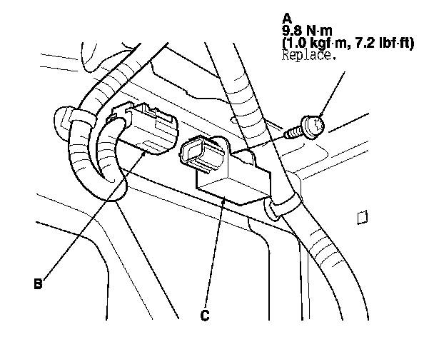 1. Install the front impact sensor with a new TORX bolt (A), then connect the engine compartment wire harness 2P connector (B) to the front impact sensor (C).