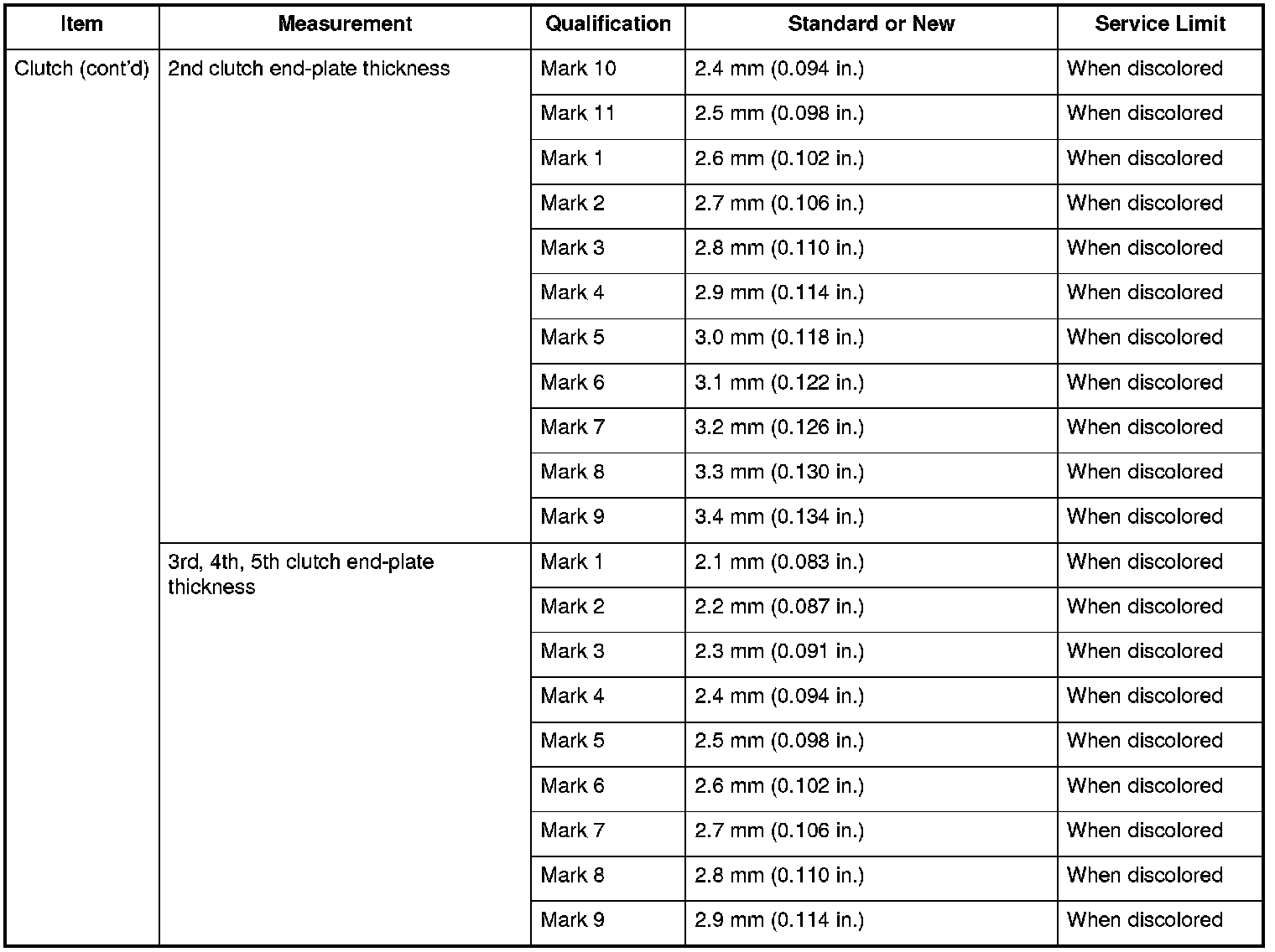 Clutch (cont'd) Specifications