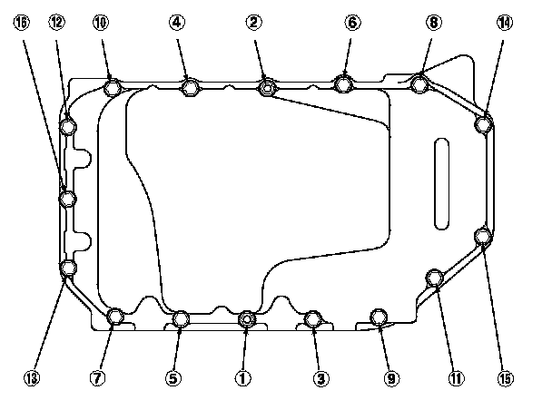 Oil PanTighten the bolts in three steps. In the final step, tighten all bolts, in sequence, to 12 N-m (1.2 kgf-m, 8.8 lbf-ft).