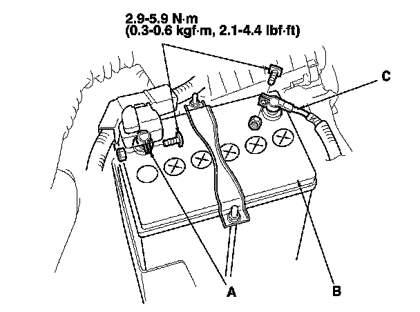 3. Reconnect the positive cable (A) to the battery (B) first, then reconnect the negative cable (C) to the battery.