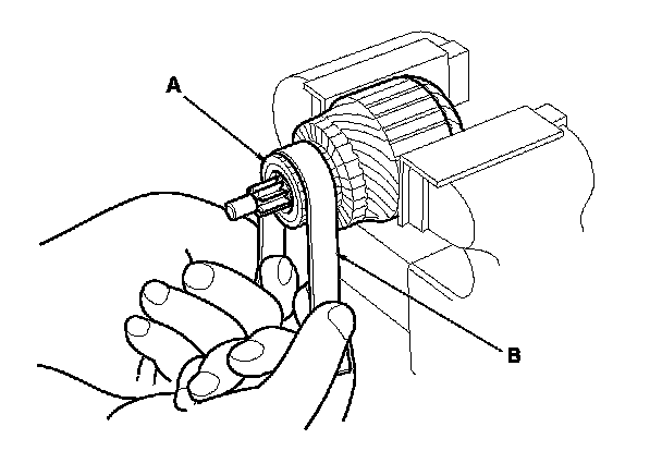 4. Check the commutator (A) surface. If the surface is dirty or burnt, resurface it with an emery cloth or a lathe to the specifications in step 5, or recondition with #500 or #600 sandpaper (B).