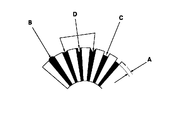 7. Check the mica depth (A). If the mica is too high (B), undercut the mica with a hacksaw blade to the proper depth. Cut away all the mica (C) between the commutator segments. The undercut should not be too shallow, too narrow, or V-shaped (D).
