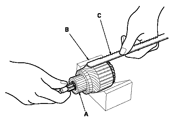 9. Place the armature (A) on an armature tester (B). Hold a hacksaw blade (C) on the armature core. If the blade is attracted to the core or vibrates while the core is turned, the armature is shorted. Replace the armature.