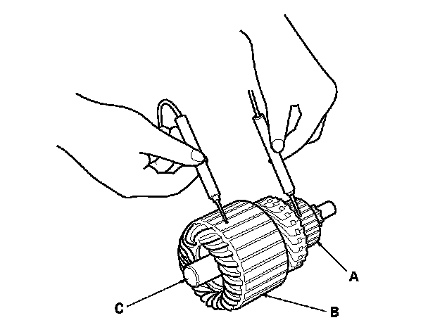 10. Use an ohmmeter to check for continuity between the commutator (A) and the armature coil core (B), and between the commutator and the armature shaft (C). If there is continuity, replace the armature.