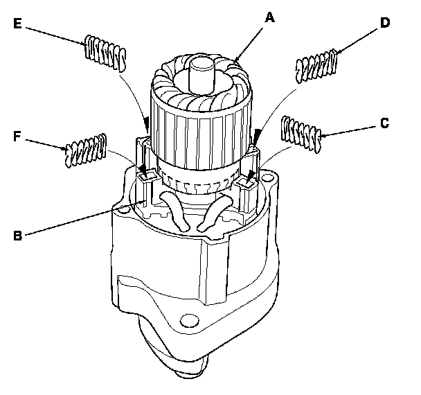 18. While squeezing a spring (C), insert it in the hole on the brush holder, and push it until it bottoms. Repeat this for the other three springs (D, E, and F).