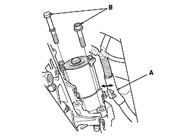 5. Remove the harness clamp (A), and remove the two bolts (B) securing the starter, then remove the starter from the engine.