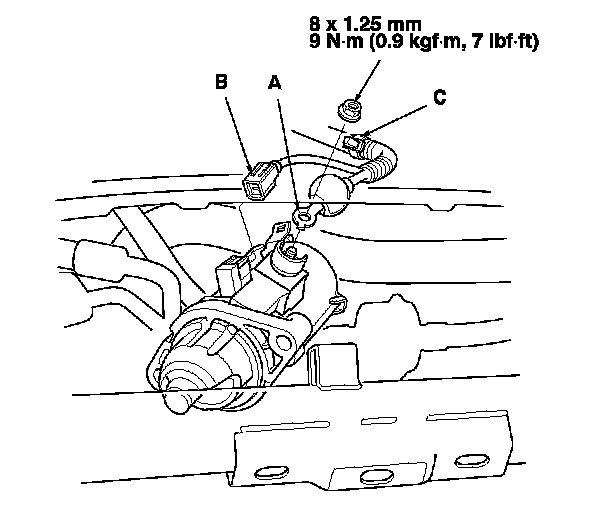7. Remove the harness clamp (C), then remove the starter.