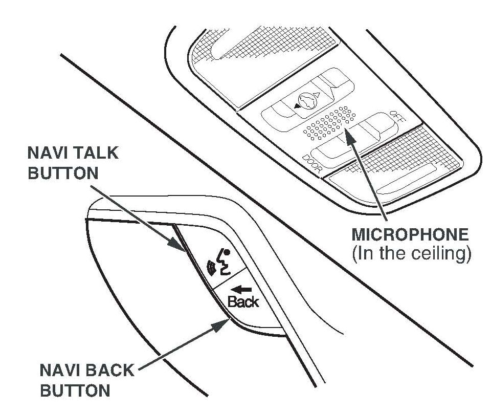 The navigation system features a voice control system that allows you to operate most of the navigation, HVAC, and audio controls with only your voice. To interact with the navigation system, use the NAVI TALK and NAVI BACK buttons. The microphone is located on the ceiling. This is the primary way to give commands to the system. Voice recognition is controlled by the NAVI TALK and NAVI BACK buttons. This is intended as the primary way to give commands to the system. Using the buttons and touching the screen allows the passenger to operate the system, but should be considered a secondary way for the driver.