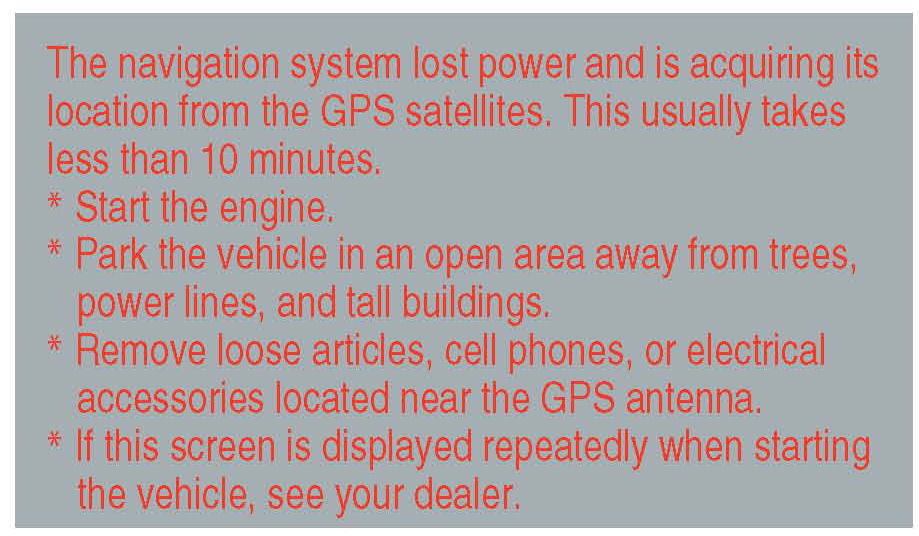 5. If the system does not initialize within 10 minutes, the screen shown below appears. The system is still initializing but does not automatically exit to the screen above when initialization is complete. Do not immediately follow the instructions on the screen. After 30 minutes, try restarting the vehicle to see if the navigation system completed the initialization. If not, follow the instructions on the screen.