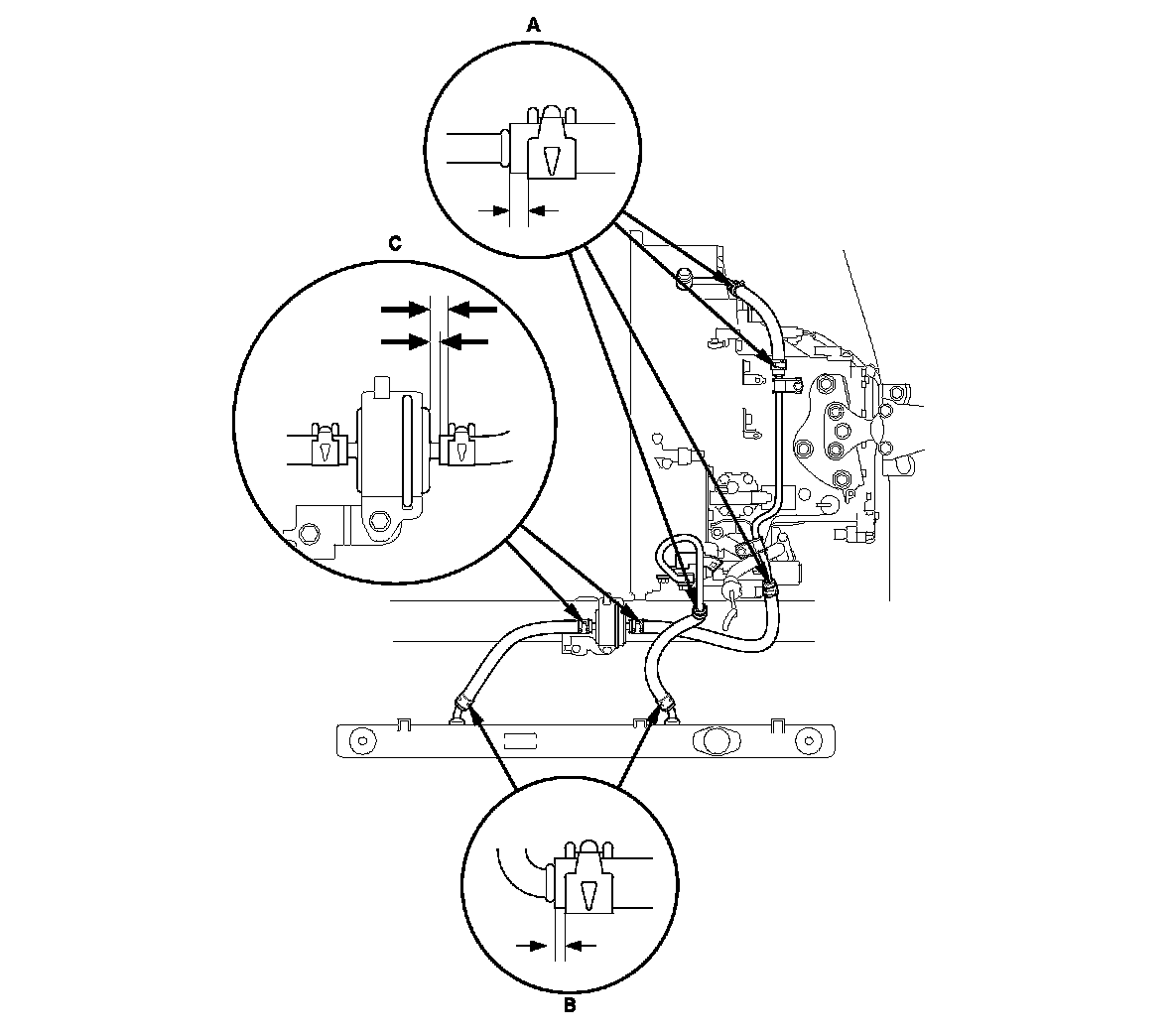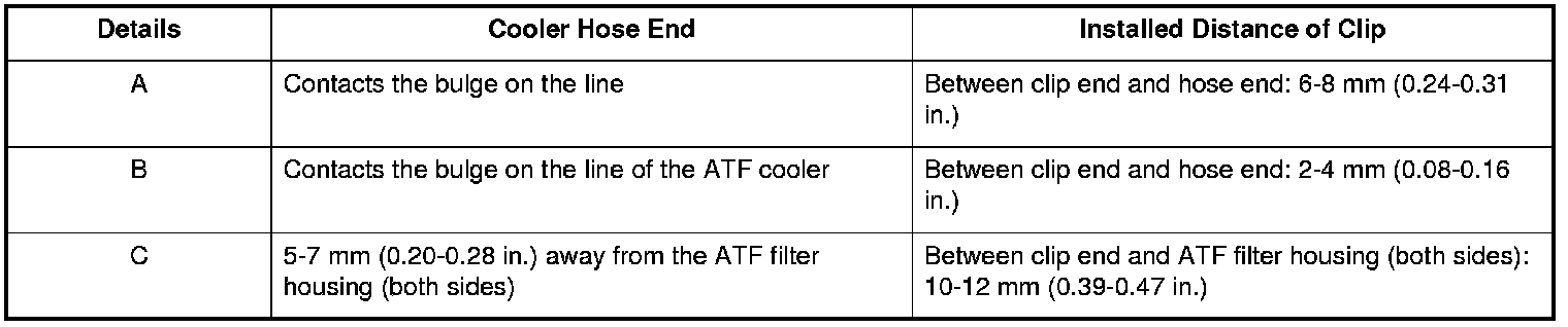 Install the ATF cooler hoses over the ATF cooler lines, and secure the hoses with the clips as in the details (A) (B) (C), shown in the following figure. Keep the tab of the clip clear of other part.