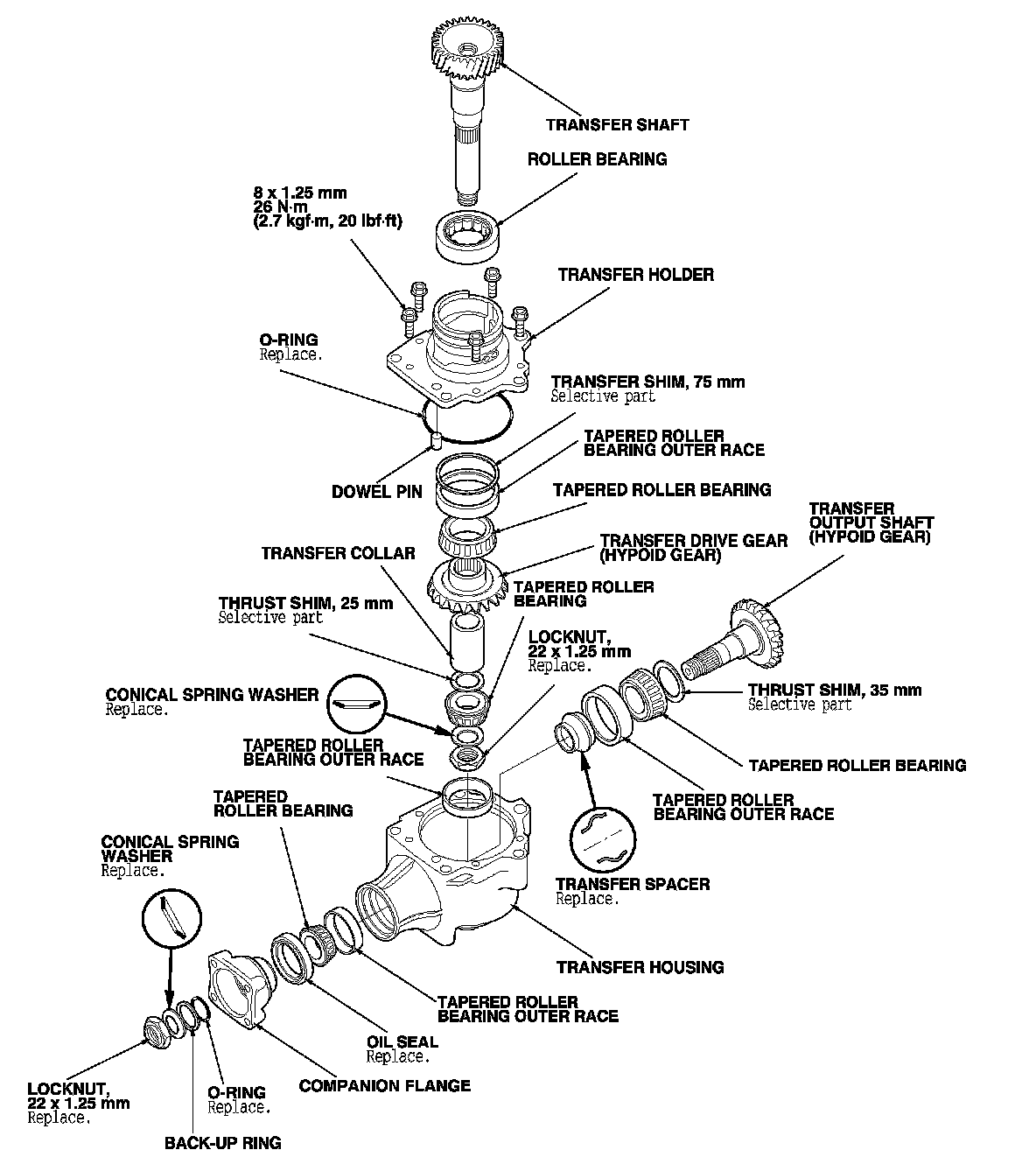 7. Remove the transfer output shaft (A) from the transfer housing (B), then remove the transfer spacer (C) from the transfer output shaft.