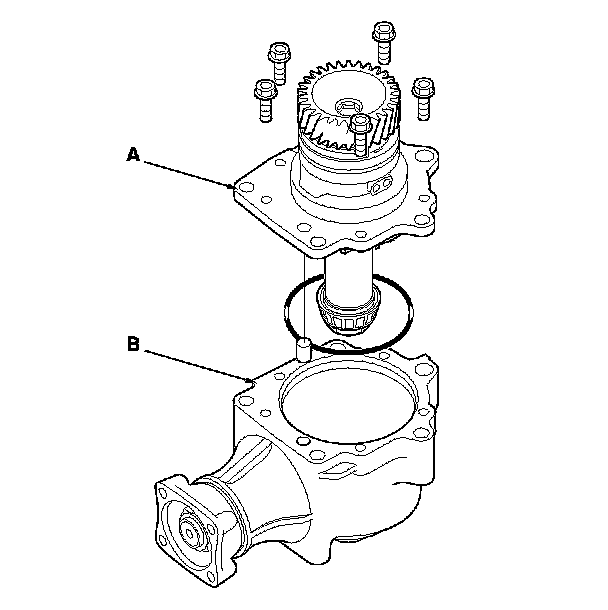 3. Secure the transfer housing (A) in a bench vise (B) with soft jaws. To prevent damage to the transfer housing, always use soft jaws or equivalent materials between the transfer housing and a vise.