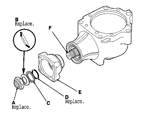 6. Remove the locknut (A), the conical spring washer (B), the back-up ring (C), the O-ring (D), and the companion flange (E) from the transfer output shaft (F).