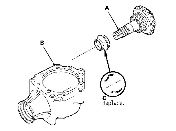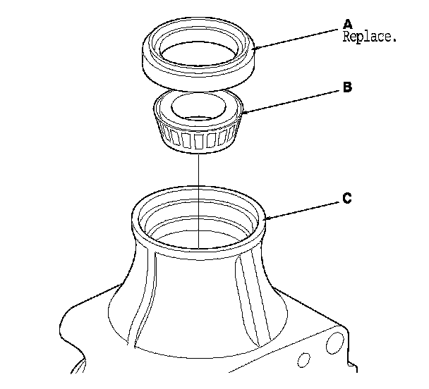 8. Remove the oil seal (A) and the tapered roller bearing (B) from the transfer housing (C).