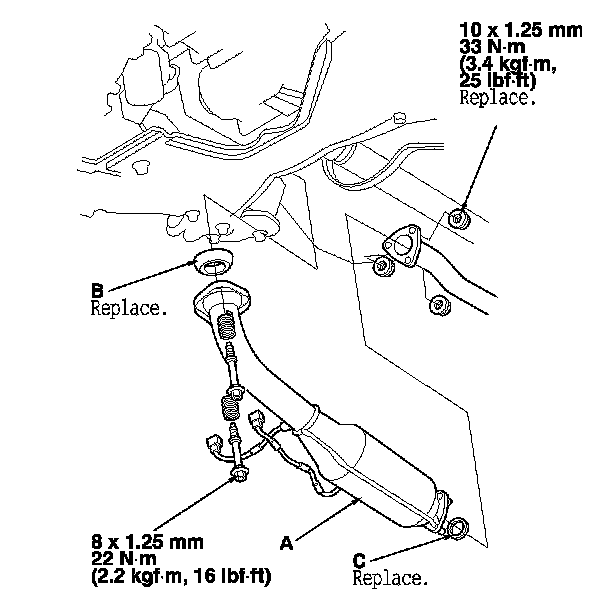 6. Install the three-way catalytic converter (A) with the bolts, new self-locking nuts, and new gaskets (B) (C).