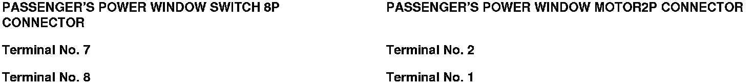 5. Check for continuity between the passenger's power window switch 8P connector terminals No. 7 and No. 8 and the passenger's power window motor 2P connector terminals No. 1 and No. 2.