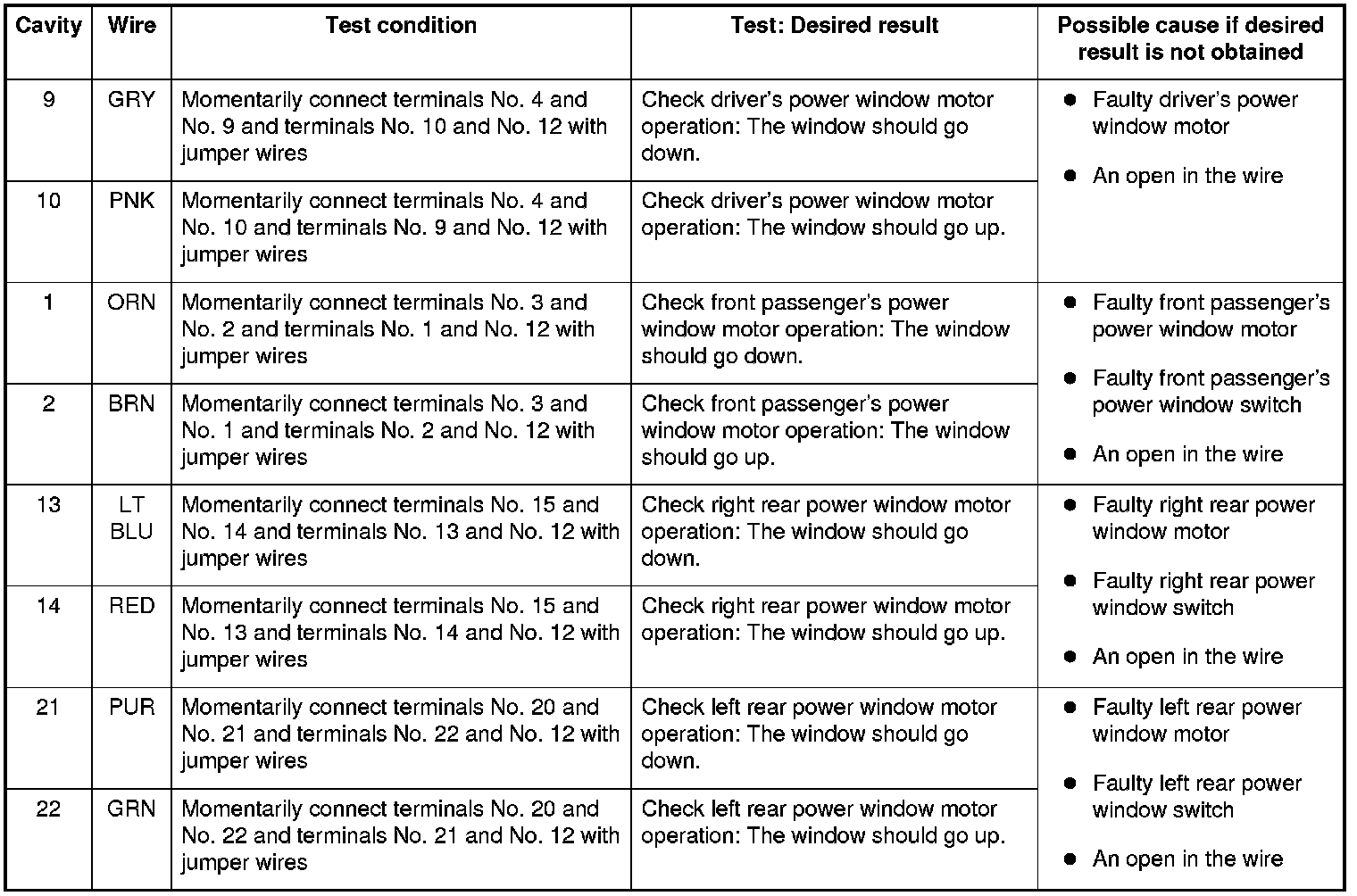 - If all the input tests prove OK, the control unit must be faulty; replace the power window master switch, and go to step 6.