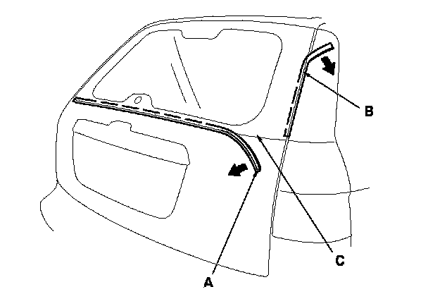 14. Set the rear window (A) in the opening, and center it. Make alignment marks (B) across the rear window and the body with a grease pencil at the four points shown. Make sure both clips (C) contact with the holes of the tailgate corner. Be careful not to touch the rear window where adhesive will be applied.