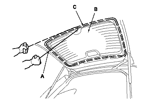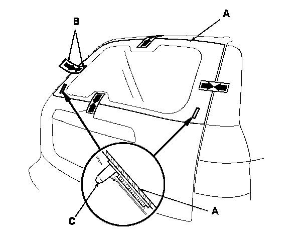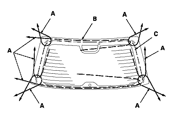 2. Remove the lower rubber dam (A) and the side rubber dams (B) from the edges of the rear window (C). If necessary, cut the rubber dams with a utility knife.