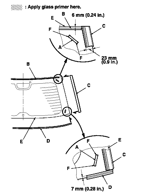 - With the printed dots (C) on the rear window as a guide, apply the glass primer to both side portions of the rear window.
