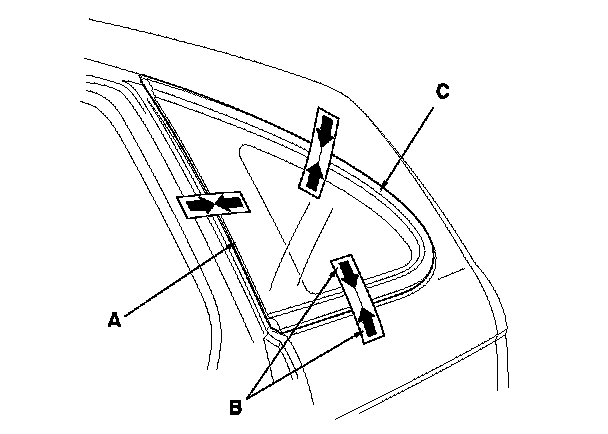 13. Set the quarter glass (A) in the opening, and make alignment marks (B) across the quarter glass and the body with a grease pencil at the three points shown. Make sure both clips (C) contact with the edge of the body holes. Be careful not to touch the glass where adhesive will be applied.