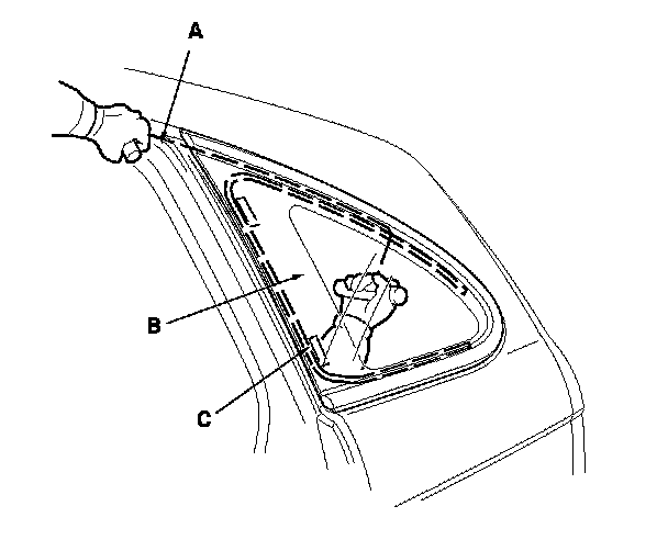 7. From inside the vehicle, use a knife (A) to cut the rear clip (B) of the quarter glass molding, then cut through the adhesive (C) of the quarter glass rear corner.
