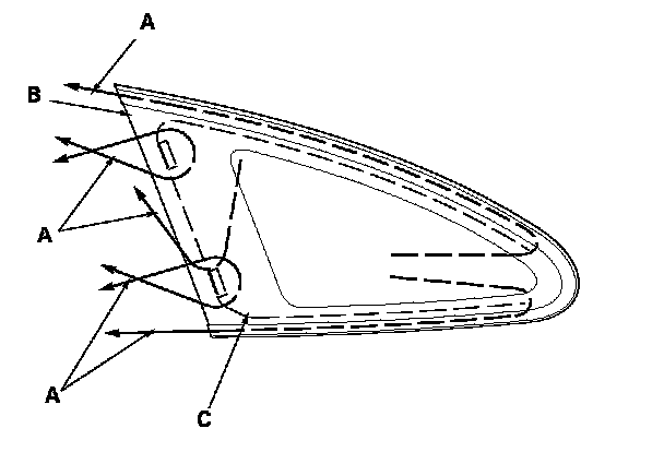 19. Put the cartridge in a caulking gun, and run a bead of adhesive (A) around the edge of the quarter glass (B) and along the front seal (C) as shown. With the printed dots on the quarter glass as a guide, apply the adhesive to the rear corner, upper corner, and lower corner portions of the quarter glass. Apply the adhesive within 30 minutes after applying the glass primer. Make a slightly thicker bead at each corner.