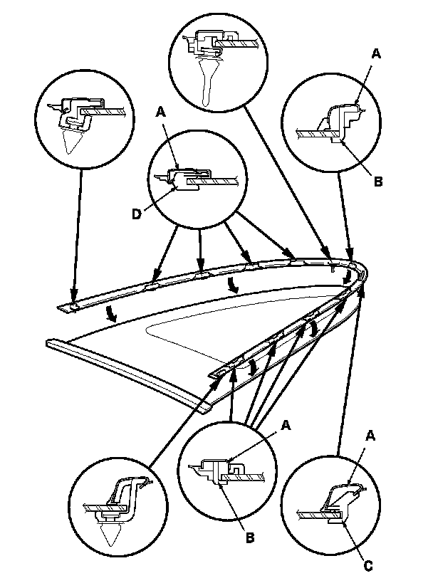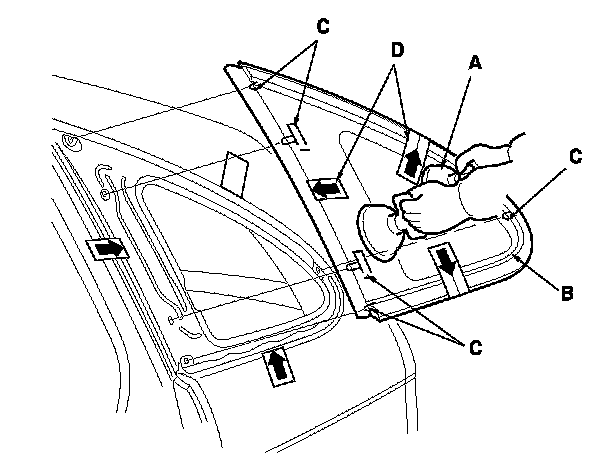 12. Attach the front seal (A), the lower clip (B), and the upper clip (C) with adhesive tapes to the inside face of the quarter glass (D) as shown. Before installing the front seal, apply primer to the inside face of the quarter glass.