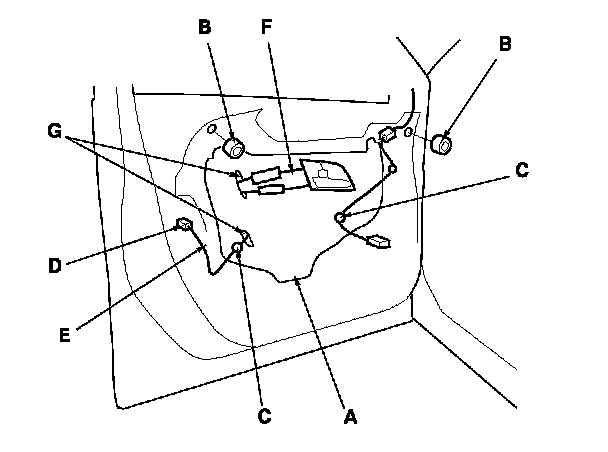 -2 Disconnect the power door lock actuator connector (D), and pass the harness (E) and the cables (F) through the holes (G) in the plastic cover.