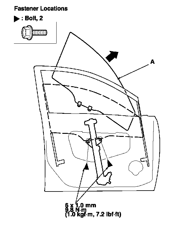 3. Carefully raise the glass (A) until you can see the bolts, then remove them. Carefully pull the glass out through the window slot. Take care not to drop the glass inside the door.