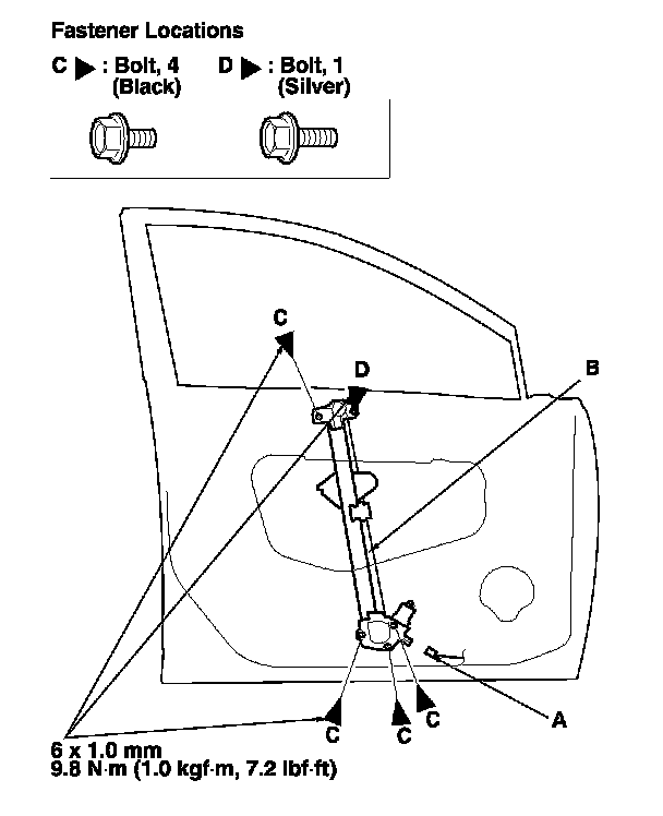 5. Remove the bolts (C), and loosen the bolt (D), then remove the regulator through the hole in the door.