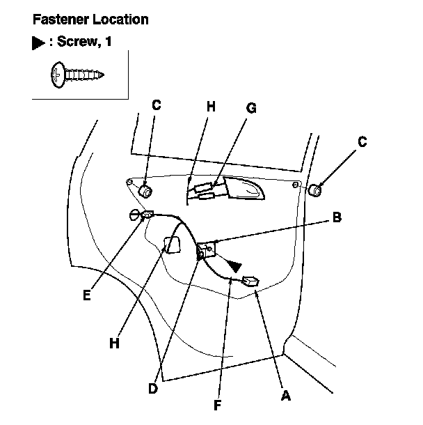 -3 Disconnect the power door lock actuator connector (E), and pass the harness (F) and the cables (G) through the holes (H) in the plastic cover.