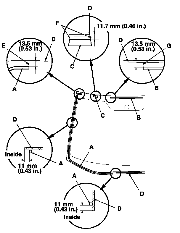 16. With a sponge applicator, apply a light coat of glass primer around the edge of the windshield (A) between the rubber dams (B, C) and the molding (D) as shown, then lightly wipe it off with gauze or cheesecloth: