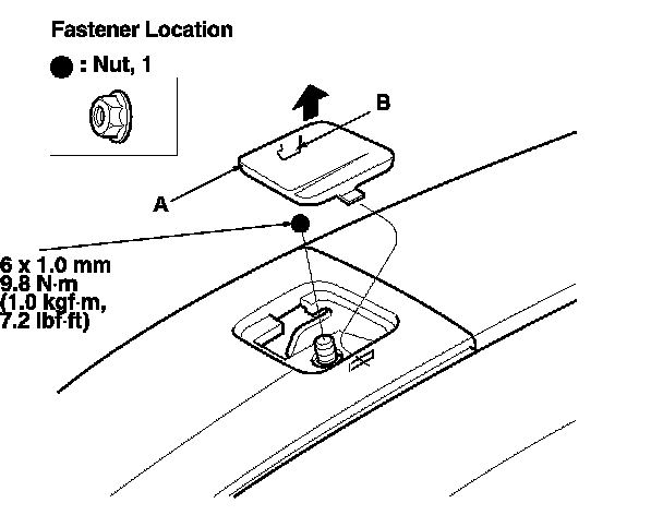 1. Using a trim tool, pry up on the front lid (A) of the front roof side trim to detach the hook (B), and remove the nut.