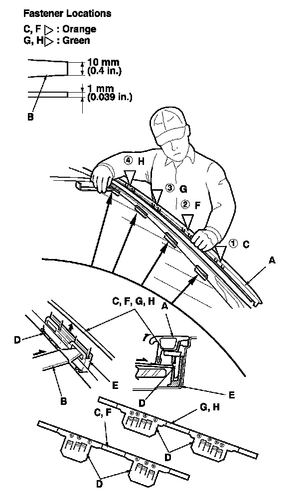 -2 While pulling the clip portion of the molding up by hand, push each of the six or eight small hooks (D) in the numbered sequence shown to release the clip from the retainer (E).