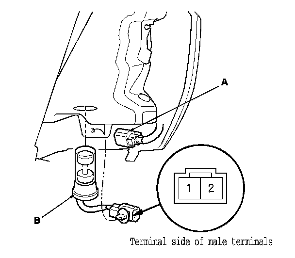 2. Disconnect the 2P connector (A) from the washer fluid level switch (B).