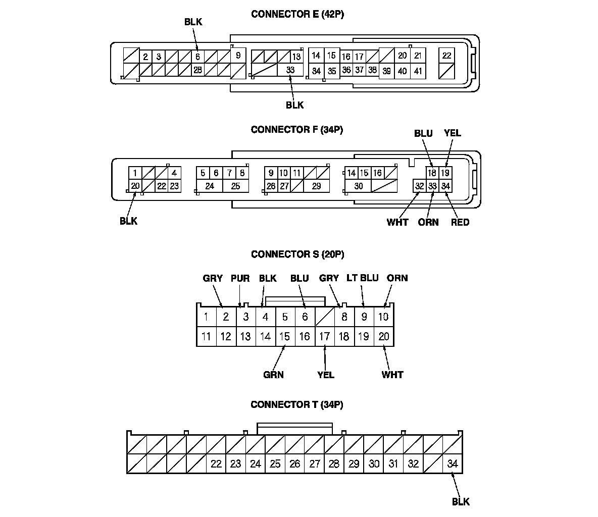 3. Disconnect under-dash fuse/relay box connectors E, F, S, and T.