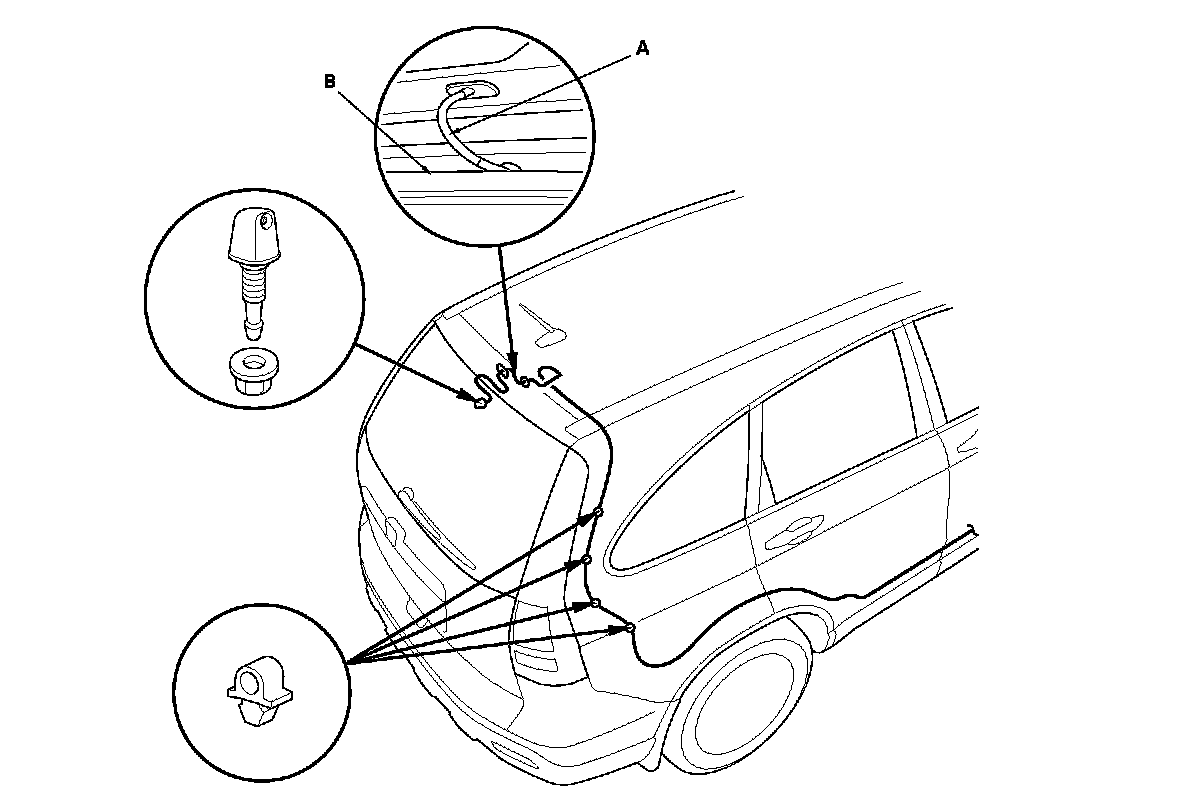 NOTE: Even if the washer tube (A) is pinched between the weatherstrip (B) and the tailgate, the washer may operate, but it may allow water to leak at the weatherstrip. Make sure the tube is aligned, and adjust the tube by twisting it as needed.