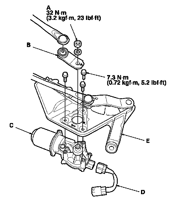 7. Disconnect the windshield wiper motor subharness (D), then remove the three bolts, and separate the windshield wiper linkage (E) from the wiper motor.