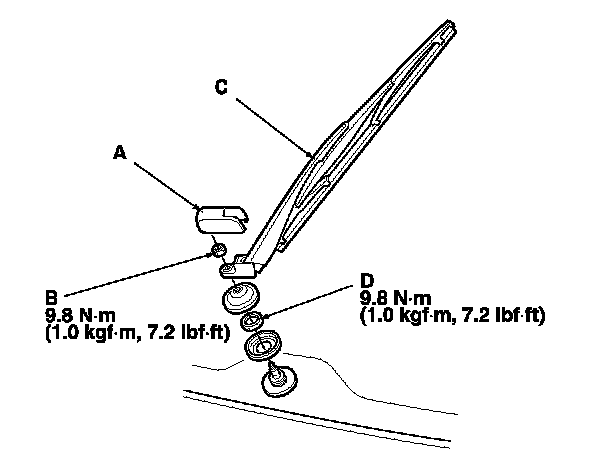 2. Remove the cap (A), mounting nut (B), wiper arm (C), and special nut (D).